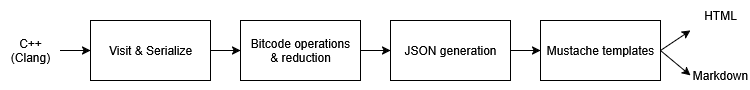 The existing Mustache backend in Clang-Doc already contained logic to create JSON documents, but they were immediately discarded when the templates were rendered. This backend is extremely beneficial to Clang-Doc because it completely eliminated any need for manual HTML tag generation, thus greatly reducing lines of code. If the JSON and template rendering logic from the existing implementation were uncoupled, we could apply the same pattern to any format we’d want to support. Markdown generation would be a similar case where templates would be used to automate the creation of all markup syntax.